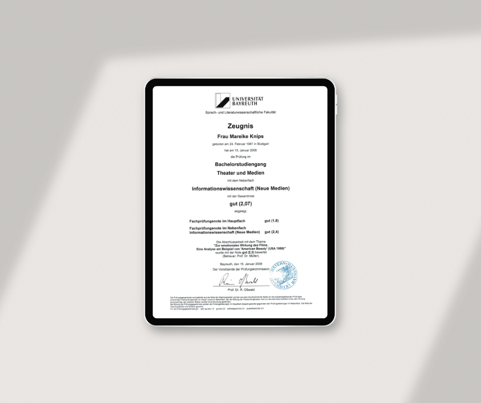Mit dem Heilprozess entschied ich mich für ein Studium an der Universität in Bayreuth. Im praxisorientierten Studiengang „Theater, Medien und Informationswissenschaften“ vertiefte ich Storytelling, Medienproduktion und Webdesign. In den Semesterferien arbeitete ich parallel für die BBDO.